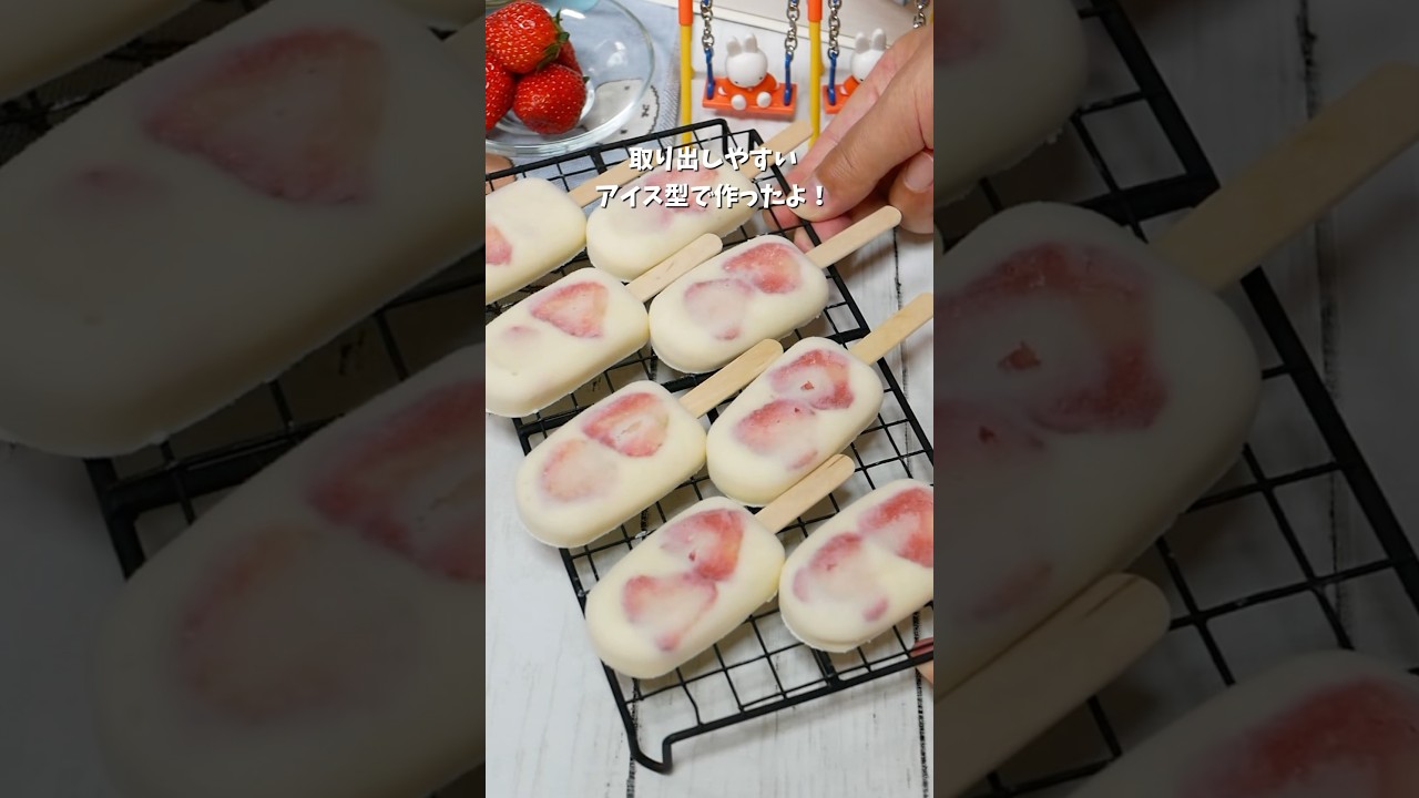 1.いちごは葉っぱを取って半分に切ってアイスシリコンモールドに入れる。