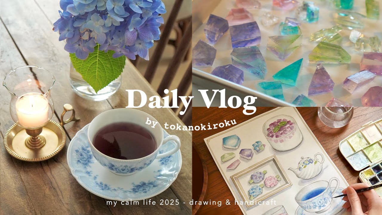 初夏のおうちカフェ☕️雨の日が楽しみになるレシピと暮らしの記録🌧️|紫蘇ジュース、琥珀糖、紫陽花ゼリー、メニュー表作りetc.